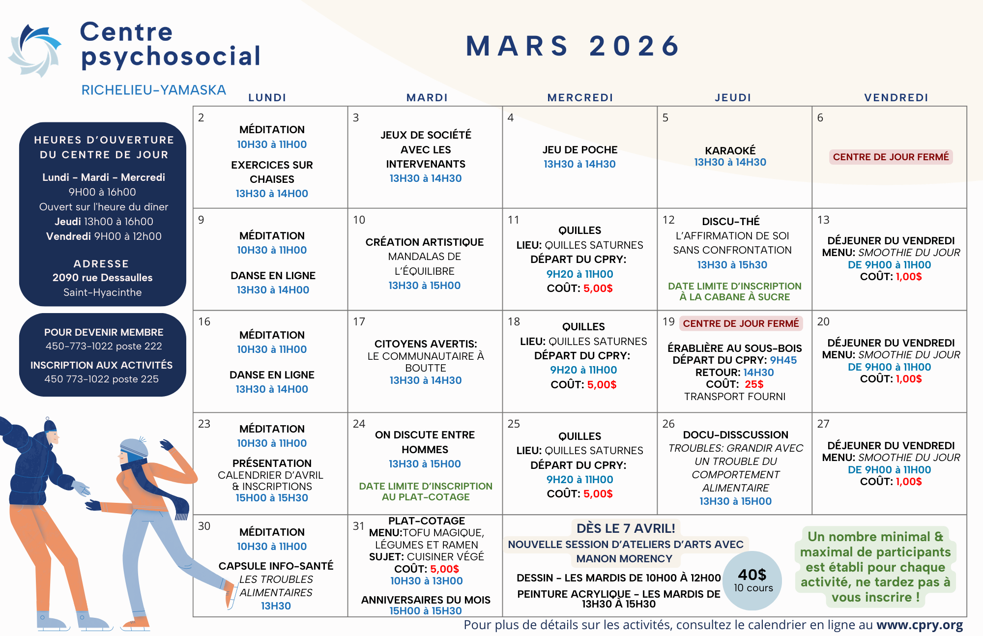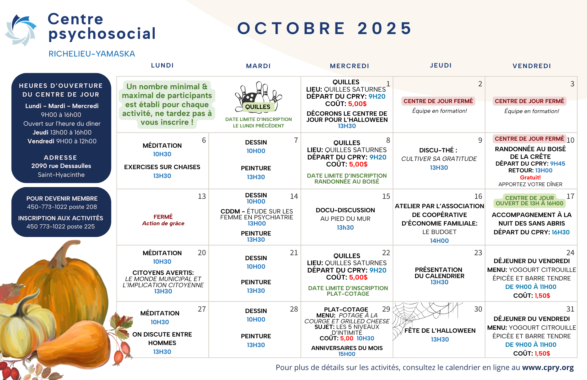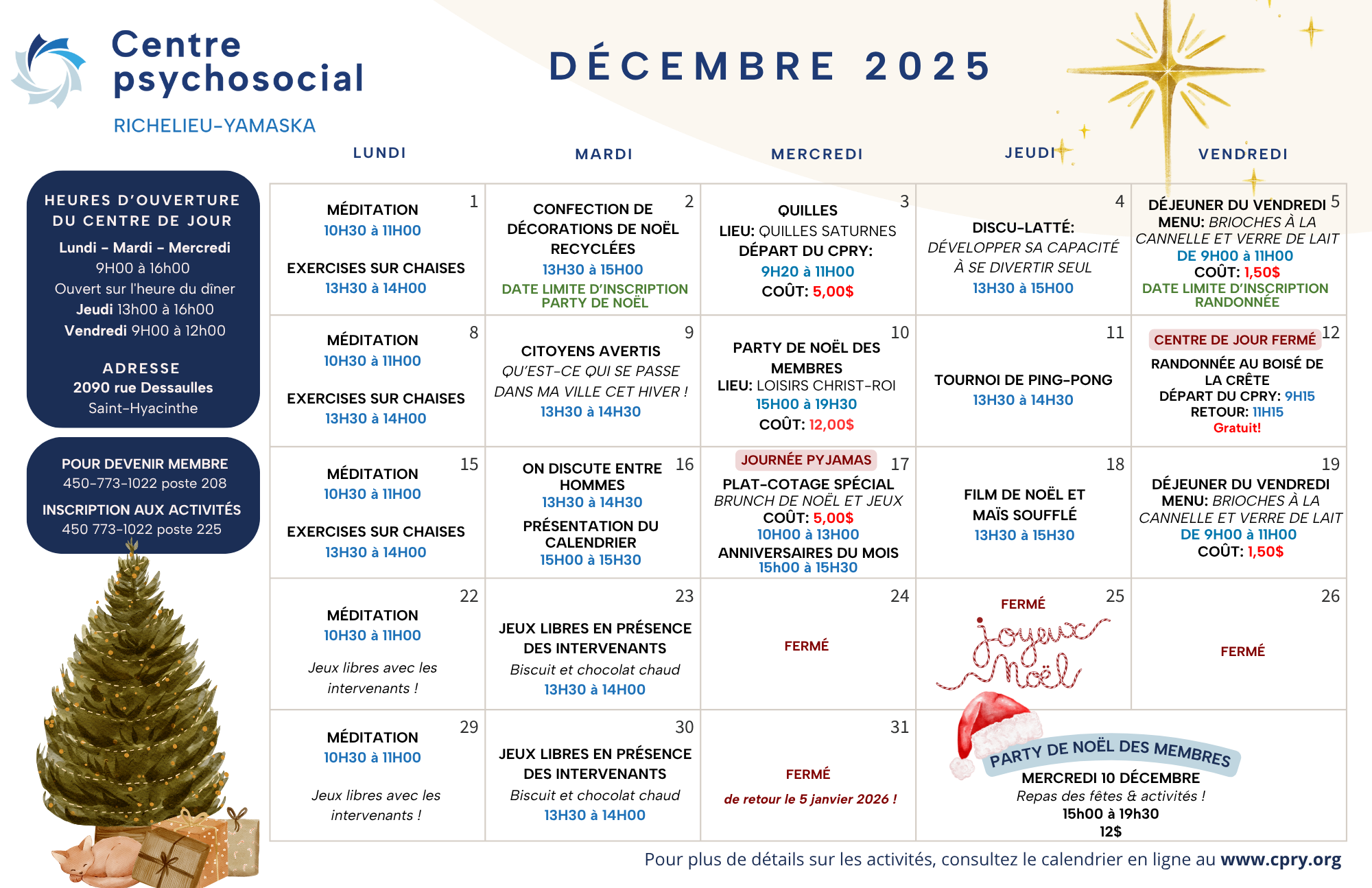 Pour devenir membre, veuillez communiquer par téléphone au centre de jour au 450 773-1022 ou par courriel à coordo@cpry.org.